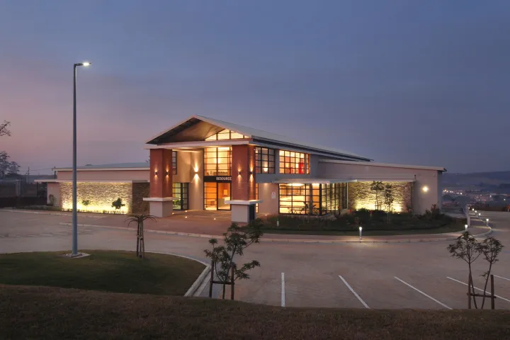 We have supplied a holistic lighting solution for this Resource Centre. On the exterior, the locally designed and manufactured LEDLUME-MIDI street light luminaire illuminates the parking area, providing effective lighting for safety and comfort. The LEDPOST, an LED bollard, lights up the walkway in the most stylish and efficient way. The entrance of the building is enhanced by the LEDDUO up- and downlighter, and the ACCENTO in-ground uplighter. Furthermore, the exterior of the building is accented by the SERIES 21 bulkhead.